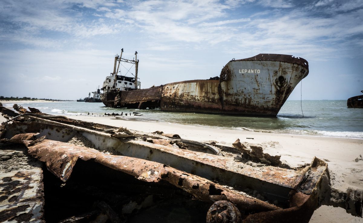 Navios abandonados ao longo de uma praia deserta parecem o cenário de um thriller pós-apocalíptico.