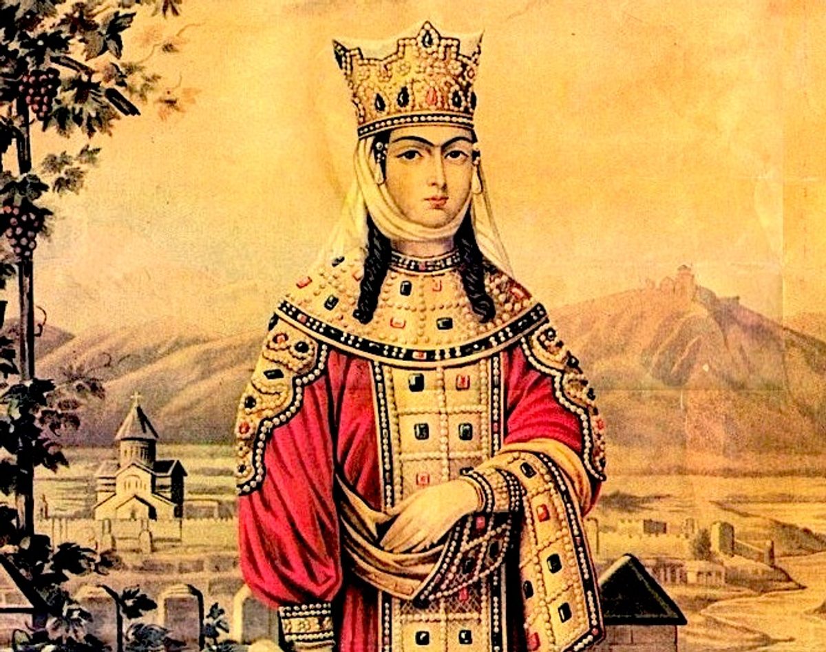 A Rainha Tamar da Geórgia, mostrada aqui em uma reprodução colorida de uma litografia de 1895, inaugurou a era de ouro da Geórgia. Domínio público