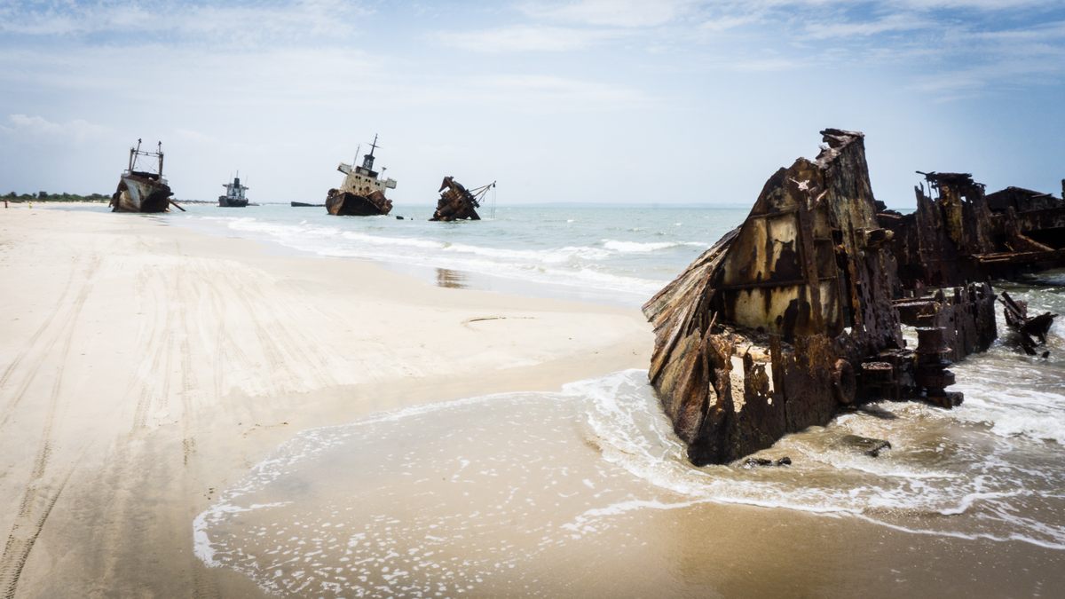 Cemitério de Navios (Panguila, Angola) Navios abandonados ao longo de...